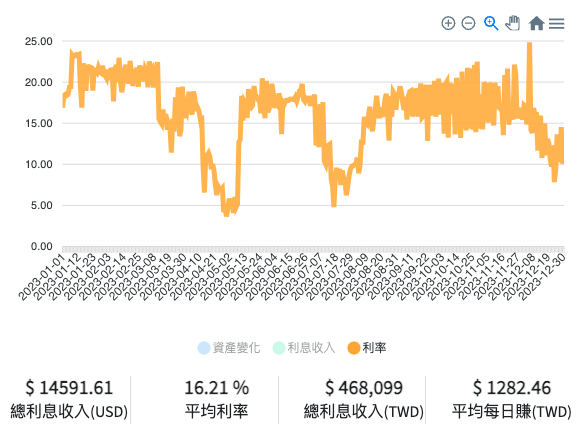 (該圖為站方真實數據於 Bitfinex 放貸 USD 2023 全年表現)